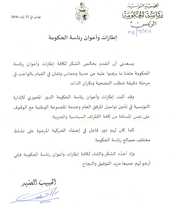 وقد ثمّن الحبيب الصيد، في رسالته التي شرتها الصفحة الرسمية لرئاسة الحكومة، دور أعوان و إطارات رئاسة الحكومة خلال الفترة التي عمل فيها معهم .
