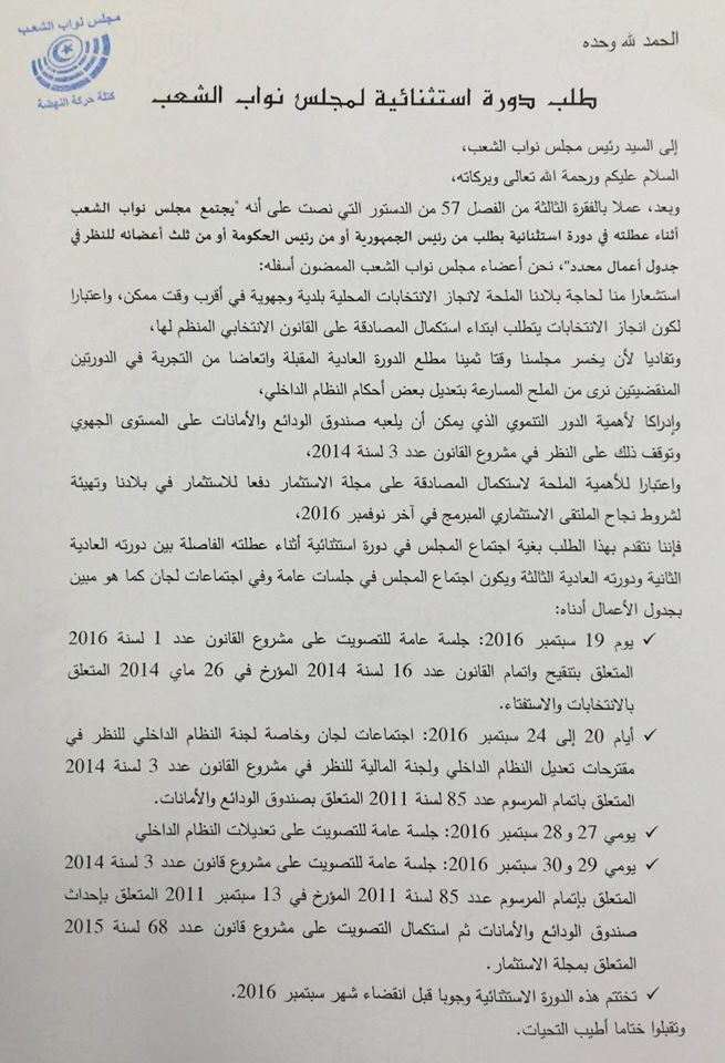 هذا وقدمت كتلة حركة النهضة مقترح لجدول أعمال الدورة الاستثنائية تجدون تفاصيلها في الوثيقة المنشورة أسفله: