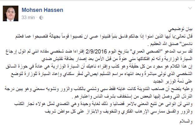 وبيّن محسن حسن، في بيانه، أنّ الأخبار المتعلقة بأنّه لم يتول إرجاع السيارة الوزارية وأنّه تمّ اِفتكاكها منه عنوةً من قِبل الأمن بعد إصدار بطاقة تفتيش ضده، هي إفتراء ضد شخصه.