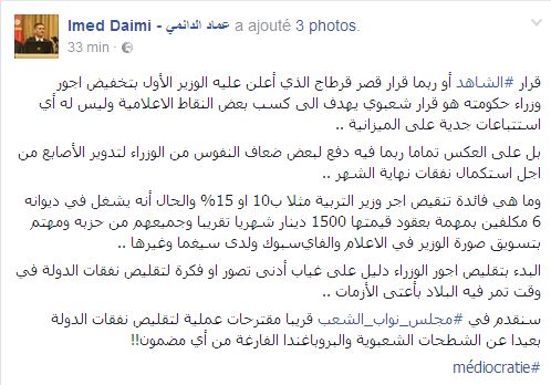 كما اضاف الدايمي قائلا "وما هي فائدة تنقيص اجر وزير التربية مثلا ب10 او 15% والحال أنه يشغل في ديوانه 6 مكلفين بمهمة بعقود قيمتها 1500 دينار شهريا تقريبا وجميعهم من حزبه ومهتم بتسويق صورة الوزير في الاعلام والفايسبوك ولدى سيغما وغيرها" متابعا القول" سنقدم في مجلس نواب الشعب قريبا مقترحات عملية لتقليص نفقات الدولة بعيدا عن الشطحات الشعبوية والبروباغندا الفارغة من أي مضمون".