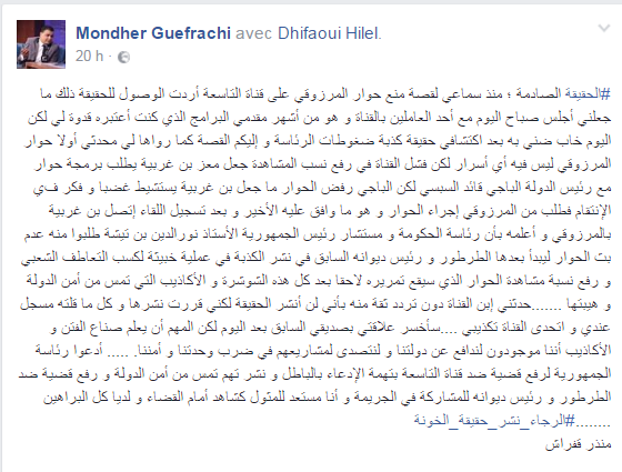 وأكّد منذر قفراش أنّه منذ سماعه لقصة منع حوار المرزوقي على قناة التاسعة أراد الوصول للحقيقة، لذلك جلس صباح يوم الجمعة مع أحد العاملين بالقناة و هو من أشهر مقدمي البرامج الذي كان يعتبره قدوة له، مشيرا إلى أنّ هذا الشخص كشف له "الحقيقة الصادمة".