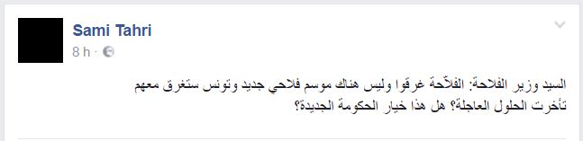 وأضاف الطاهري ، في نداء موجّه لوزير الفلاحة سمير بالطيب عبر تدوينات على حسابه الخاص على الفايسبوك، أنّ تونس ستغرق مع الفلاحين إذا غرقوا وأنّ الحلول العاجلة تأخرت مما يطرح تساؤل هل أنّ هذا خيار الحكومة الجديدة أم ماذا.