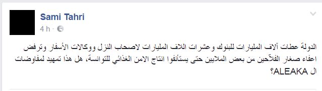 ووجّه سامي الطاهري كلامه أيضاً للحكومة ككل وللأحزاب مُذكّرهم بأنّ الفلاحين ليسوا قاعدة انتخابية فقط بل هم من البواسل الذي يُدافعون على أمن تونس الغذائي، مُشيراً إلى أنّ الدولة أعطت المليارات للبنوك وعشرات ألاف المليارات لأصحاب النزل ووكالات الأسفار في حين ترفض إعفاء صغار الفلاّحين من "بعض الملايين" حتى يستأنفوا انتاج الامن الغذائي للتونسيين.
