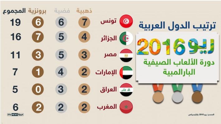 وتصدّرت تونس الدول العربية برصيد الميداليات، 19 ميدالية، منها 7 ذهبية و6 فضية و6 برونزية، كما أنّها اِحتلت المركز الواحد والعشرين عالميا.