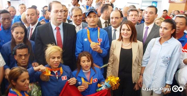 وكان في استقبال الوفد رئيس الحكومة يوسف الشاهد الذي كان مرفوقا بوزيرة شؤون الشباب والرياضة ماجدولين الشارني ووزير النقل أنيس غديرة ووزير الشؤون الاجتماعية محمد الطرابلسي وكاتب الدولة للرياضة عماد الجبري وعدد من نواّب الشعب والوجوه الرياضية والفنية والإعلامية وعائلات الرياضيين.
