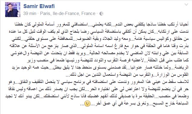 سمير الوافي : اِرتكبت خطأ ساذجا باِستضافتي للمغرور أسامة الملولي ، وهذا ما طلبه مني قبل بدء التسجيل