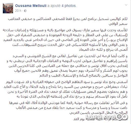 وقال أسامة الملولي أنّ سمير الوافي بقيّ وفياً لأسلوبه الكلاسيكي في خلق الحدث بترويج الشبهات، مُشيراً إلى أنّه كان ينتظر من الوافي الترّفع غير أنّه خان الميعاد وفق تعبيره، موضحاً أنّه تحدث عن تفاصيل لقائهمع رئيسي حركة النهضة وآفاق تونس، وميوله للنهضة وقناعتها التي تربطه بها كما تحدث عن إعجابه بآفاق تونس و صداقته مع جملة من القياديين في كلتا الحزبين الذين يجوب لهم الشكر ويتشرّف بهم جميعا بصدق عميق.