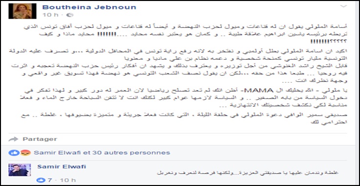 وفي هذا السياق، نشرت الاعلامية التونسية بثينة جبنون تدوينة على صفحتها الخاصة على الفايسبوك، هاجمت من خلالها أسامة الملولي، كما أنّها توجّهت باللوم إلى سمير الوافي، حيث قالت "صديقي سمير الوافي دعوة الملولي في حلقة الليلة ، التي كانت فعلا جريئة و متميزة بضيوفها ، غلطة .. مع احترامي لك".