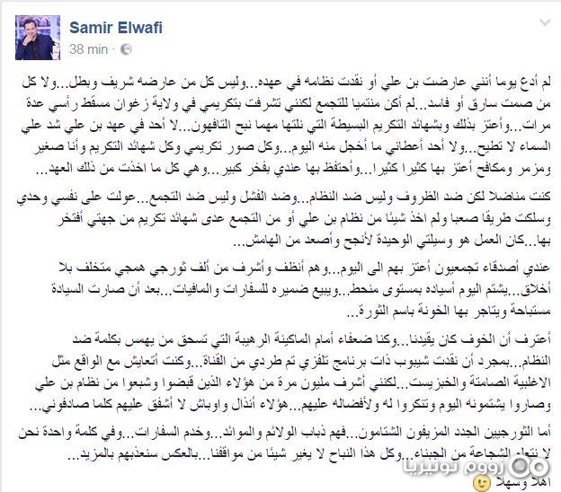 هذا وأشار سمير الوافي إلى أنّه كان مناضلا لكن ضد الظروف وليس ضد النظام وضد الفشل وليس ضد التجمع وأنّه عوّل على نفسه وحده وسلك طريقا صعبا ولم يأخذ شيئا من نظام بن علي أو من التجمع عدى شهائد تكريم من جهته التي يفتخر بها، مُشدّداً على أنّ العمل هو وسيلته الوحيدة لينجح ويصعد من الهامش.