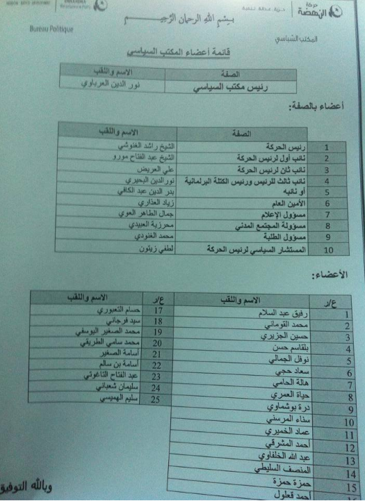 وفي ما يلي التركيبة الجديدة للمكتب السياسي لحركة النهضة: