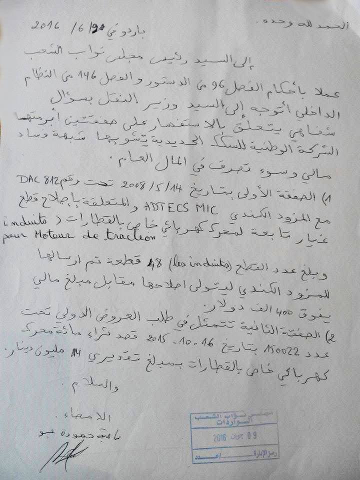 هذا وأشار التيار الديمقراطي، في بيان توضيحي له إلى أن تفقدية وزارة النقل فتحت تحقيقا في شبهة فساد بالشركة المذكورة وذلك بعد تقدمت النائبة سامية عبو بسؤال شفاهي لوزير النقل نمع اظهار الوثيقة التي تدين صاحب الشبهة أثناء الجلسة العامة ليقرر الوزير فيما بعد غلق الملف إثر كل إجراءات البحث معبرا عن استنكاره لتستّر الوزير على الفساد في حكومة ترفع شعار مكافحة الفساد.