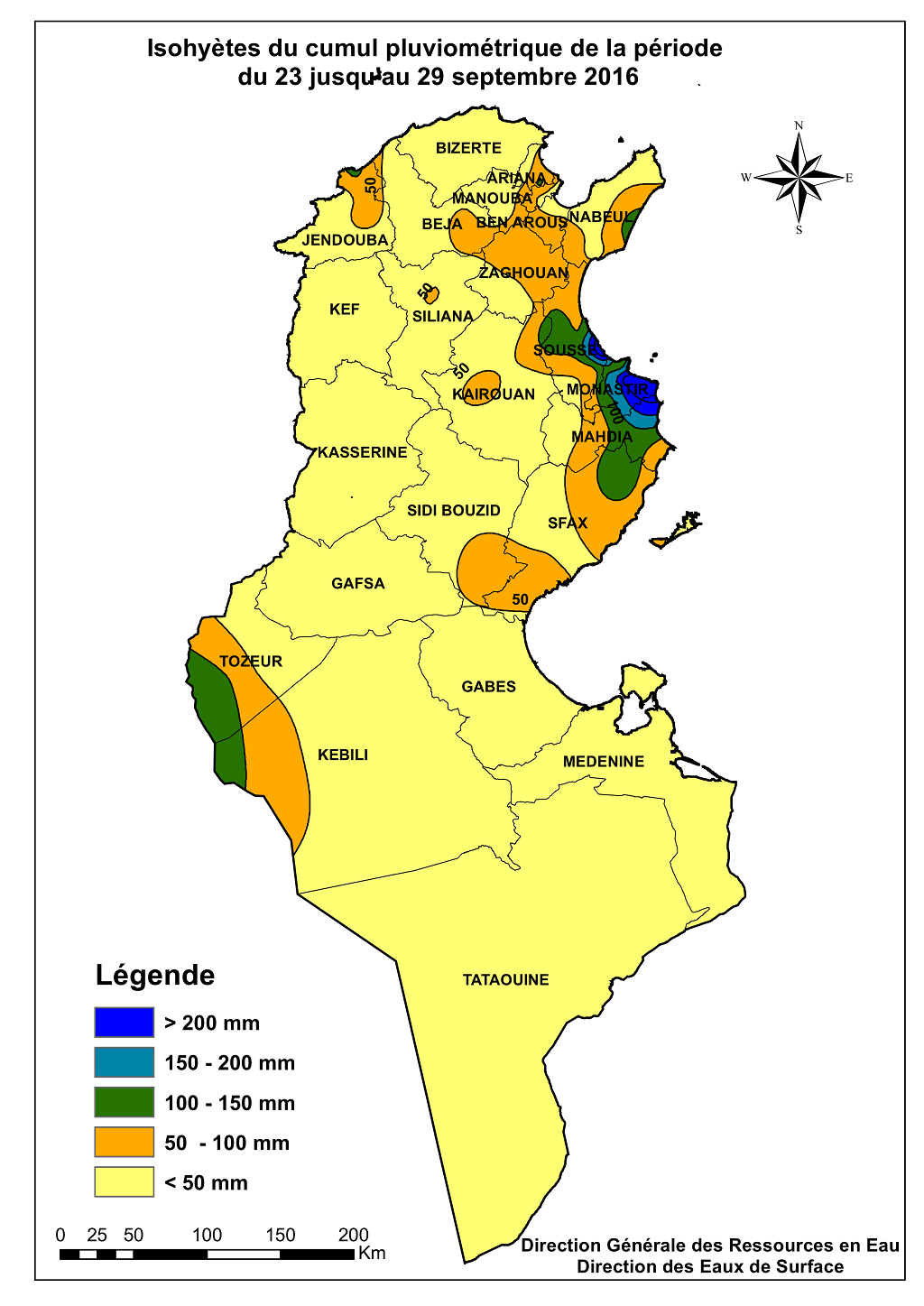 أما بالنسبة للفترة الممتدة من 23 إلى 29 سبتمبر 2016 فقد تجاوزت كميات الأمطار المسجلة 200 مم بجهة الساحل، حيث سجلت 308 مم بسوسة و255 مم بالمهدية و242 مم بطبلبة. كما تراوحت الأمطار المسجلة بتونس الكبرى بين 19 مم و119 مم بولاية أريانة ولم تتجاوز 85 مم بالجنوب (نفطة).