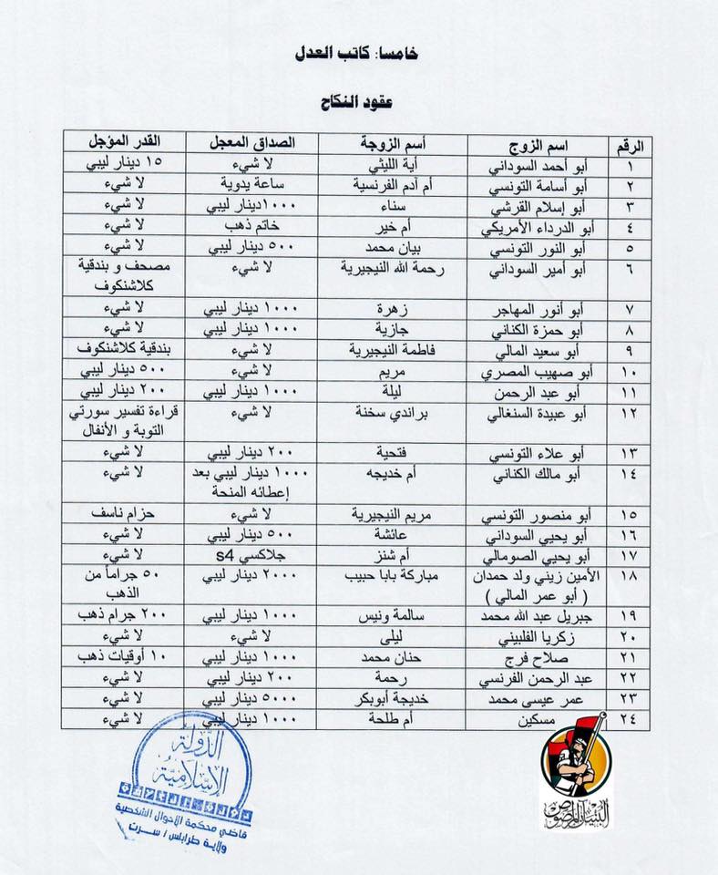 وقد تعلقت هذه الوثائق بقائمة جديدة لـ"عقود نكاح" معتمدة من قاضي "محكمة الأحوال الشخصية"، والتي كشفت عدد 24 عقد نكاح لأفراد عناصر التنظيم الإرهابي من جنسيات مختلفة من بينها السوداني والتونسي والسنغالي والمصري والمالي والصومالي والنيجيرية و برز من بينهم الأمريكي والفرنسي والفرنسية والفلبيني.