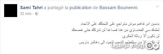 وأضاف سامي الطاهري لياسين ابراهيم الذي وصفه بـ"الفغنساوي" أنّه لن يكون إلاّ "زبالة العكري" و إلاّ من الذي سيلفظهم الشعب ليعود لدهاليز باريس، وذلك وفق تعبيره.