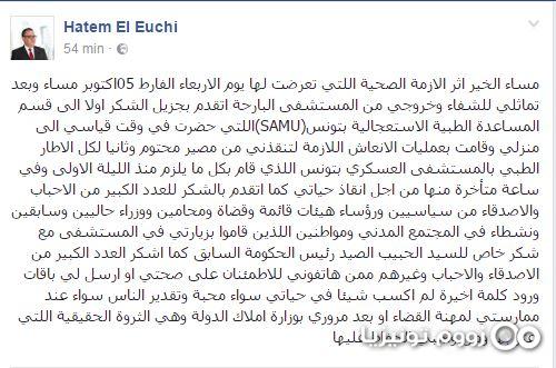 وتقدّم الوزير السابق بالشكر أولاً لقسم المساعدة الطبية الاستعجالية بتونس اللتي حضرت في وقت قياسي إلى منزله وقامت بعمليات الإنعاش اللازمة لتنقذه من مصير محتوم، وثانياً لكل الاطار الطبي بالمستشفى العسكري بتونس واللذي قام بكل ما يلزم منذ الليلة الـولى وفي ساعة متأخرة منها من أجل انقاذ حياته.
