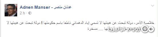 وأضاف منصر في تدوينة فايسبوكية، أنّ الدولة التي تبحث عن هيئتها لا تُسمي إياد الدهماني ناطقاً باِسم حكومتها و نور الدين بن تيشة مُستشاراً لدى رئيسها .