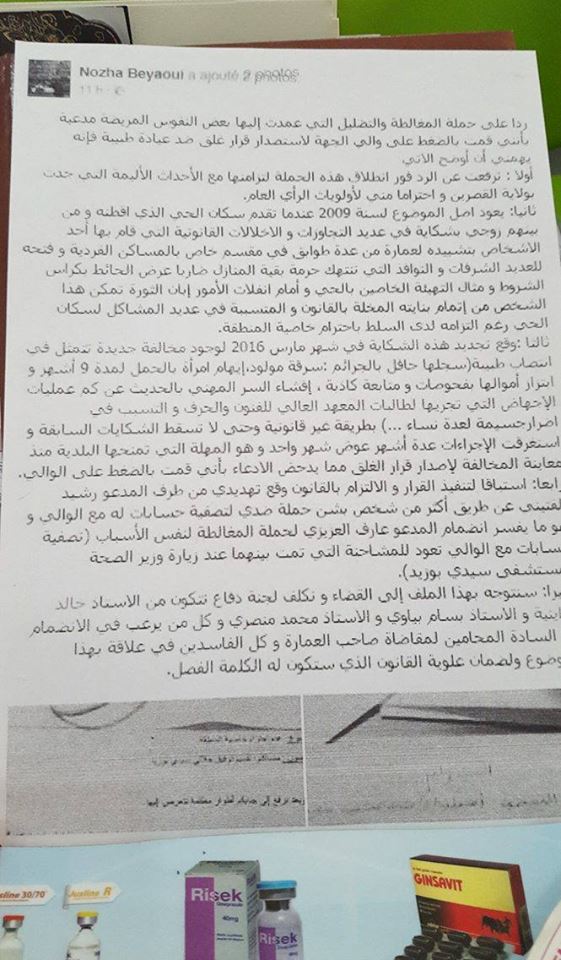 وقالت الطبيبة أنّ النائبة تقدّمت بشكوى ضدّها لغلق عيادتها، بمساعدة البلدية التي تدخّلت لتنفيذ القرار رُغم أنّ العيادة مفتوحة بالقانون وبموجب عقد كراء لا لبس فيه، مُتّهمة إيّاها بالتسبب في الإزعاج وذلك بسبب "توافد السيارات والمرضى"، فضلا عن اتهمامها بإحداث تعديلا على الطابق الأرضي للعمارة دون ترخيص من البلدية في حين أنّ التعديلات التي قامت بها الطبيبة كانت من الداخل وهو حقّ يكفله لها القانون.