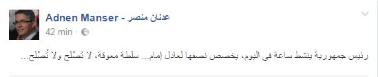 وعلّق القيادي بحراك تونس الإرادة، عدنان منصر، في تدوينة له على الفايسبوك، أنّ رئيس جمهورية ينشط ساعة في اليوم، يخصص نصفها لعادل إمام قائلاً "سلطة معوقة، لا تَصْلح ولا تُصْلح".