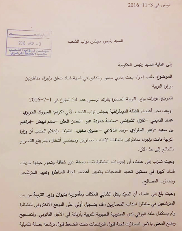 تقدّم نواب الكتلة الديمقراطية بعريضة لرئيس مجلس نواب الشعب وذلك للمطالبة بإجراء بحث إداري معمق والتدقيق في شبهة فساد تتعلق بإجراء مناظرتين بوزارة التربية.