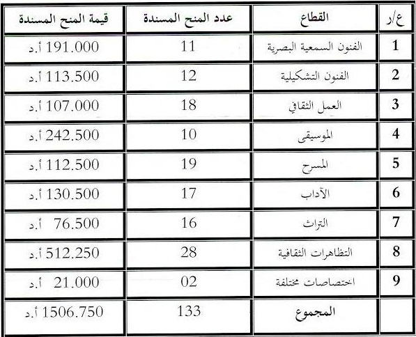 في إطار تدخّل الوزارة لدعم المبادرات الثقافية للجمعيات عقدت اللجنة الفنية المكلفة بإسناد التمويل العمومي للجمعيات إلى موفى شهر أكتوبر 2016 ستة عشر جلسة عمل رصدت خلالها 133 منحة بمبلغ إجمالي قدره 1.506.750 ألف دينار موزعة حسب القطاعات على النحو التالي :