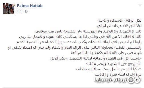وفي هذا الخصوص، دوّنت فاطمة الحطاب على حسابه الخاص على الفايسبوك ردّاً نفت فيه إيقافها وأكّدت أنّه يم يكن هنالك أي إعتداء لفظي أو غيره داحل قاعة المحكمة وأثناء المرافعة، مُشيرة إلى أنّ كل ما شاع حول هذا الموضوع هدفه تسييس القضية لمحاولة التاثير على الرأي العام و القضاء وفق تعبيرها.