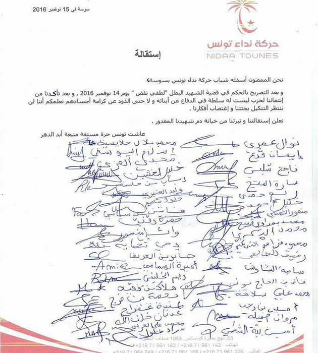 أصدر شباب حركة نداء تونس بسوسة اليوم الثلاثاء 15 نوفمبر 2016، بيانا، أعلنوا من خلالها استقالتهم من الحزب.