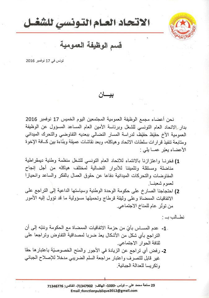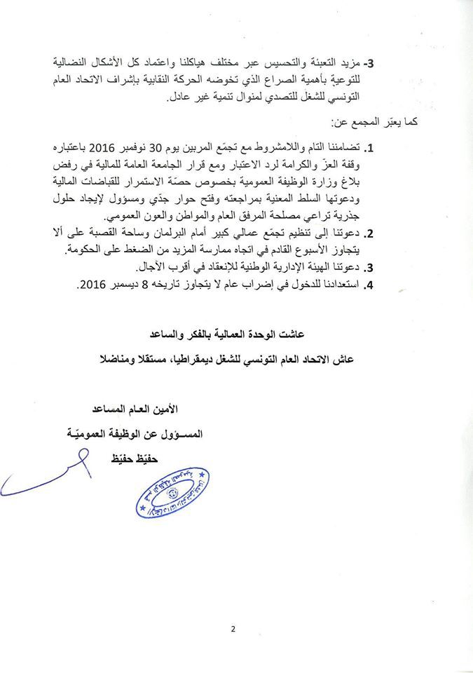 وأعلن قسم الوظيفة العمومية استعداده للدخول في اضراب عام لا يتجاوز تاريخه 8 ديسمبر المقبل، داعيا إلى تنظيم تجمع عمالي كبير أمام البرلمان و ساحة القصبة على ألا يتجاوز الأسبوع القادم.