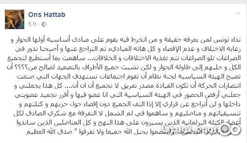 وأكّدت الحطّاب أنّها لن تتراجع عن هذا القرار إلاّ في صورة اِلتفاف الجميع دون إقصاء حول حزبهم و كتلتهم و تنسيقياتهم و المساهمة في لمّ الشمل.