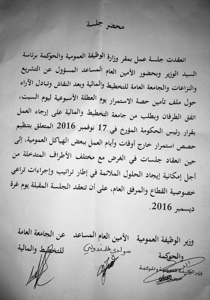 أعلن الإتحاد العام التونسي للشغل، في بيان له اليوم الخميس 24 نوفمبر 2016، أنّه تمّ الاتفاق على إرجاء العمل بقرار رئيس الحكومة المتعلق بتأمين حصص الاستمرار يوم العطلة الأسبوعية ليوم السبت ببعض الهياكل العمومية.
