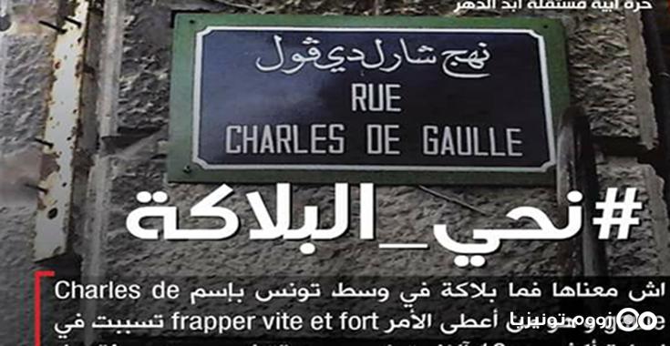 ويأتي هذا الشعار على خلفية شهادة لأحد ضحايا الصراع البورقيبي اليوسفي في تونس يُدعى حمادي غرس، أكّد فيها أنّ شارل ديغول هو مجرم حرب بالنسبة لتونس متسائلا "فلماذا توجد اليوم "يافطة" في العاصمة اسمها شارل ديغول ؟"
