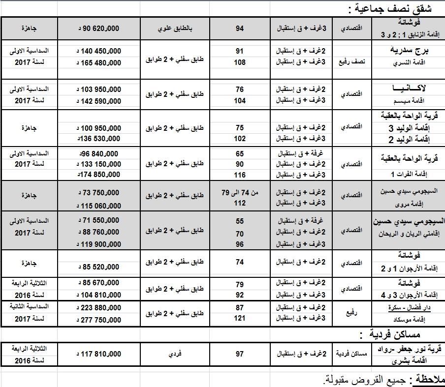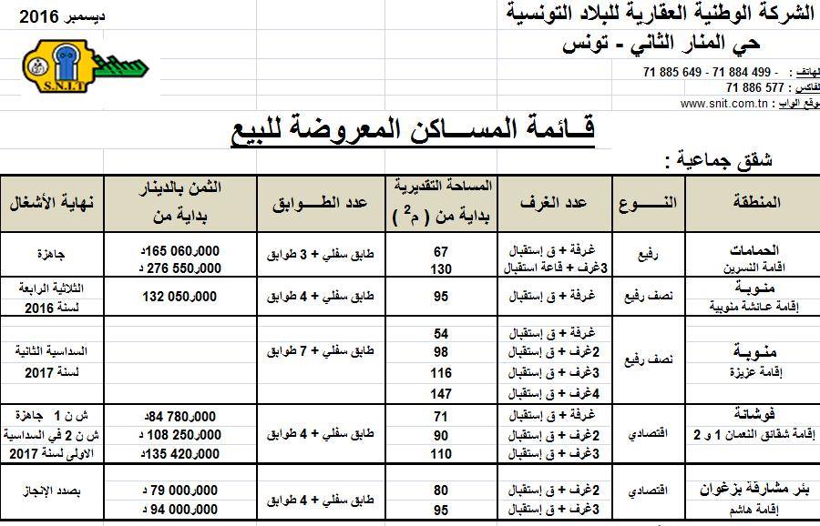 نشرت الشركة الوطنيّة العقاريّة للبلاد التونسيّة قائمة المشاريع المعروضة للبيع لشهر نوفمبر 2017: