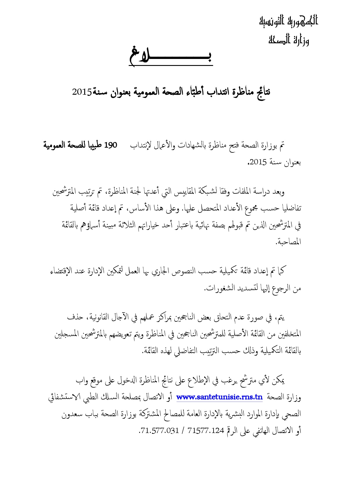 ويمكنكم الاطلاع على النتائج عبر الرابط التالي : نتائج مناظرة انتداب أطباء الصحة العمومية بعنوان سنة 2015