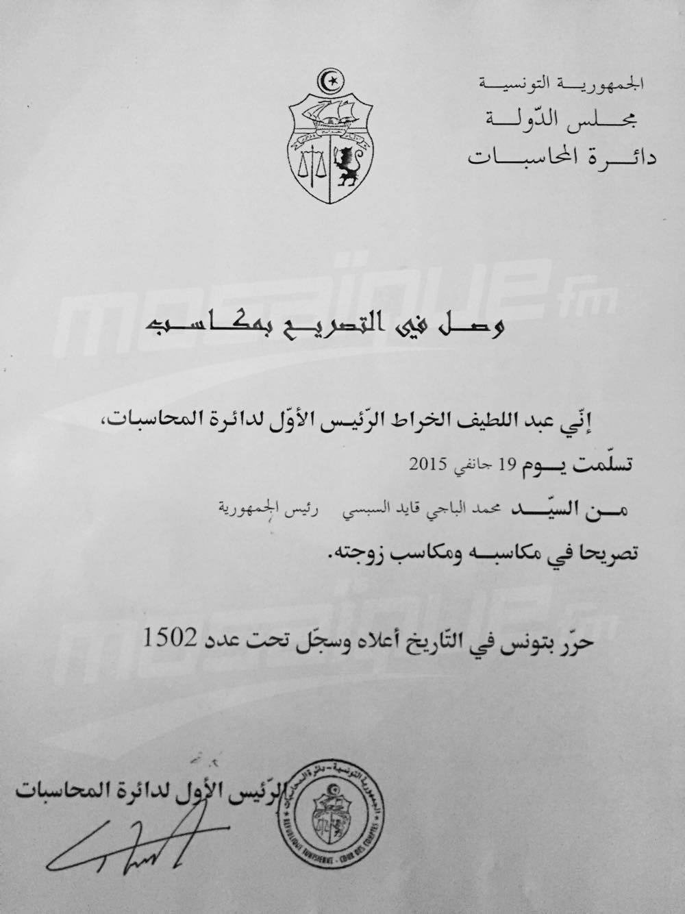 وقد قدّم ذات المصدر وثيقة تتمثل في "وصل في التصريح بمكاسب" تُثبت أنّ الباجي قائد السبسي صرّح لدائرة المحاسبات يوم 19 جانفي 2015 بمكاسبه و مكاسب زوجته.
