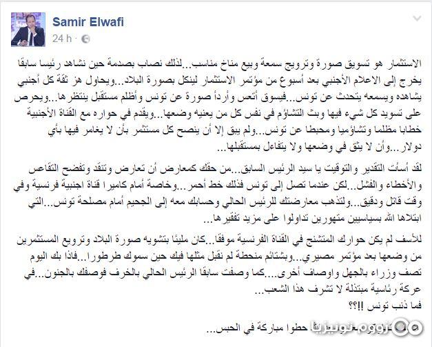 وأشار سمير الوافي إلى أنّه لم يبقَ إلاّ أن ينصح كل مستثمر بأن لا يغامر في تونس بأي دولار وأن لا يثق في وضعها ولا يتفاءل بمستقبلها، مُضيفاً أنّ المنصف المرزوفي أساء التقدير والتوقيت وأنّه يحق له المعارضة و النقد غير أنّ تونس فذلك خط أحمر.