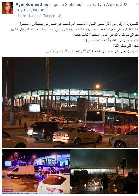 حيث نشرت المقدمة صورا كانت قد التقطتها للملعب الذي كان سيحتضن دربي العاصمة التركية أمس، وذلك قبل ساعتين فقط من حدوث الانفجار، لتكون بذلك قد نجت من موت وشيك.