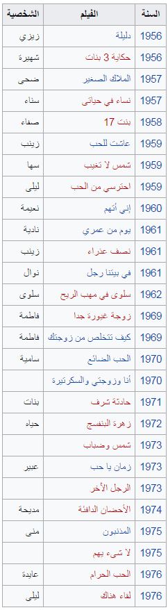 كان أول فيلم سينمائي لها هو دليلة عام 1956، والذي ظهرت فيه لبضع دقائق مع شادية، وعبد الحليم حافظ.