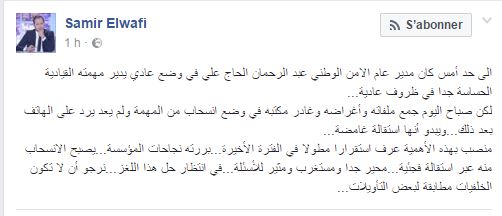 هذا ويذكر أن اجتماعا جمع صباح اليوم الخميس وزير الداخلية الهادي المجدوب بالمدير العام للامن الوطني وقد تكون الاستقالة تمت خلال هذا الاجتماع.