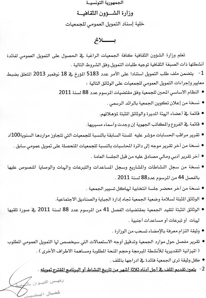 فعلى كافة الجمعيات الراغبة في الحصول على التمويل العمومي لفائدة أنشطتها ذات الصبغة الثقافية توجيه طلبات التمويل وفق الشروط التالية :
