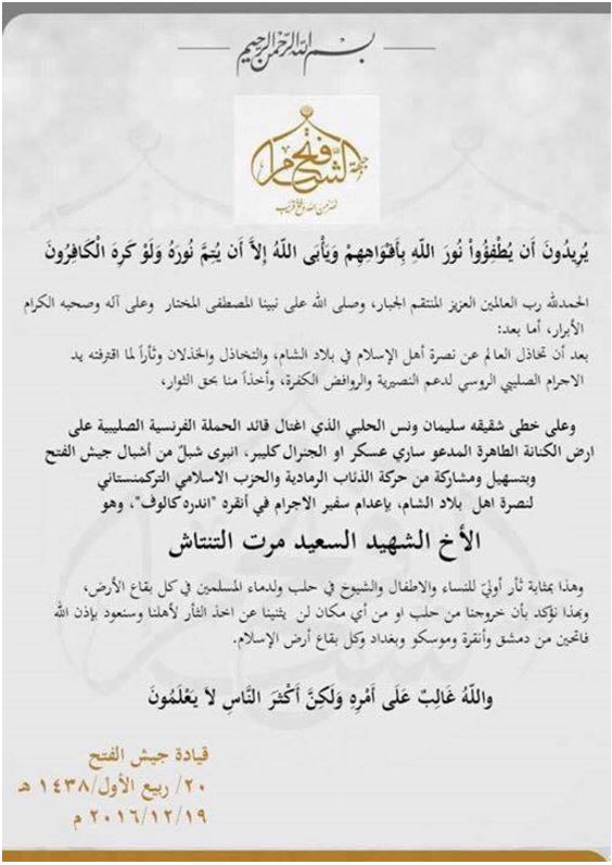 ومواصلة لهذا "المسلسل" تداولت بعض المواقع بيانا قيل أنّه صادر عن تنظيم "فتح الشام" تبنّى فيه هذه العملية.