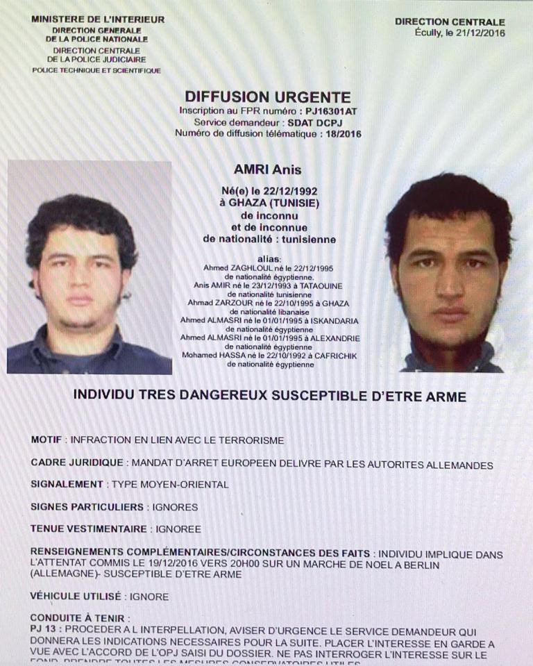 أظهرت مذكرة توقيف أنيس العامري، المشتبه به الرئيسي بتنفيذ هجوم الدهس في برلين، أنه استخدم 6 أسماء مستعارة و3 جنسيات مختلفة في بطاقات هوية.