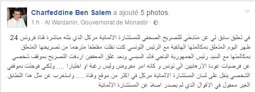 وقد تبيّن إثر تناقل هذا الخبر في أغلب المواقع الإلكترونية ووسائل الإعلام أنّ ما ورد في الاِتصال لم يأتِ على لسان ميركل بل على لسان شاب تونسي، وهو إعلامي يُدعى شرف الدين بن سالم، نقل مُقتطفاً مُترجماً من تصريحها المُتعلّق بهذه المُكالمة بطريقة ساخرة تُعبر عن موقفه الشخصي عن فرضيات عودة الارهابيين إلى تونس.