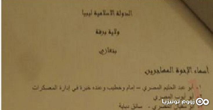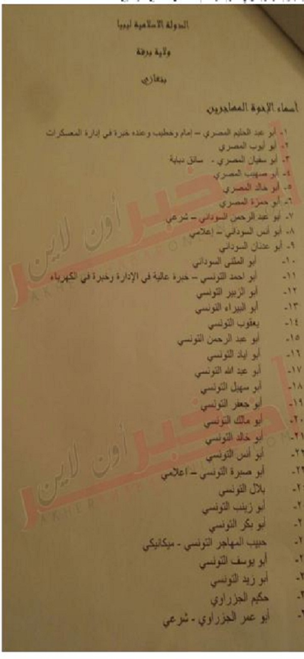 أعلنت القوات المسلحة في بنغازي عثورها على وثيقة تحتوي أسماء الإرهابيين المهاجرين بولاية برقة.