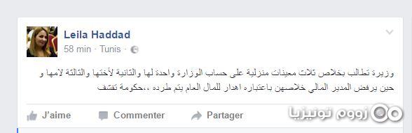 ووفق تدوينة ليلى حداد، فإنّ المعينات ستكون واحدة لها والثانية لأختها والثالثة لوالدتها، غير أنّ المدير المالي رفض خلاصهن بإعتباره إهدار للمال العام.