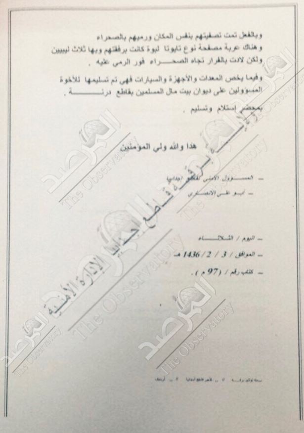 أما بخصوص المعدات التي كانت بحوزة الصحفيين سفيان الشورابي ونذير القطاري والسيارات التي كانوا على متنها، قال المسؤول الامني التابع لتنظيم "داعش" الإرهابي أنّه تم تسليمها إلى ما يُسمى بـ "ديوان بيت مال المسلمين" في مدينة درنة الليبية.