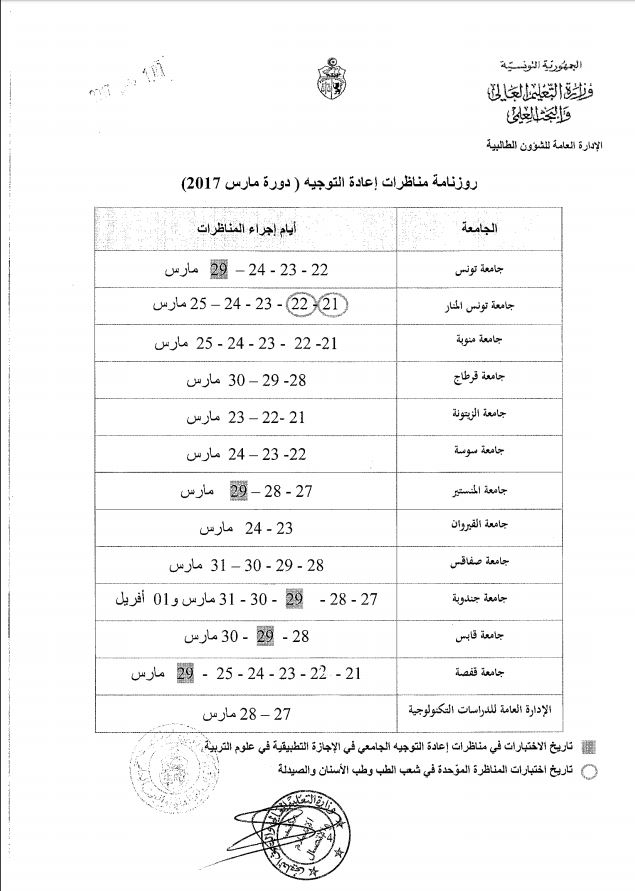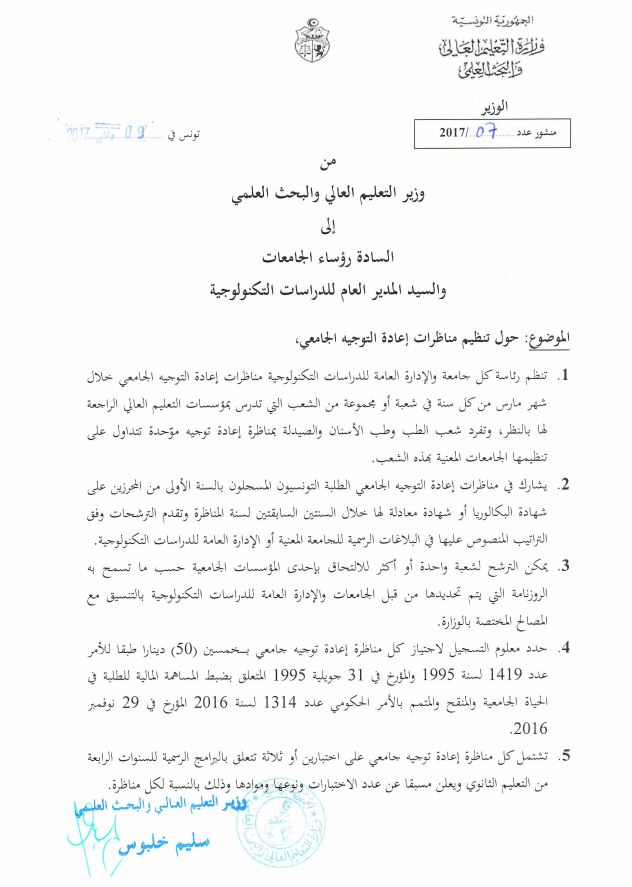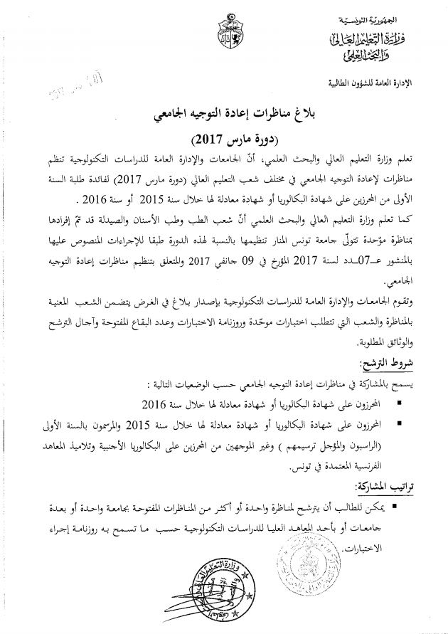تعلم وزارة التعليم العالي والبحث العلمي عن تنظيم مناظرات لإعادة التوجيه الجامعي في مختلف شعب التعليم العالي (دورة مارس 2017).
