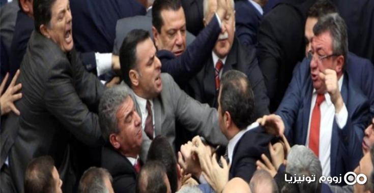 وتبادل نواب من حزب العدالة والتنمية الحاكم وحزب الشعب الجمهوري وهو حزب المعارضة الرئيسي اللكمات ودفعوا بعضهم بعضا بعد أن تجمعوا حول المنصة.