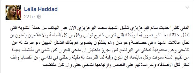 إثر هذه اللحقة، دوّنت المحامية ليلى حداد على صفحتها الرسمية على الفايسبوك قائلة أنّ اِتصال جمعها مع شقيقق محمد البوعزيزي " سالم البوعزيزي"، وأنّ الحديث الذي دار بينهما آلمها كثيراً.