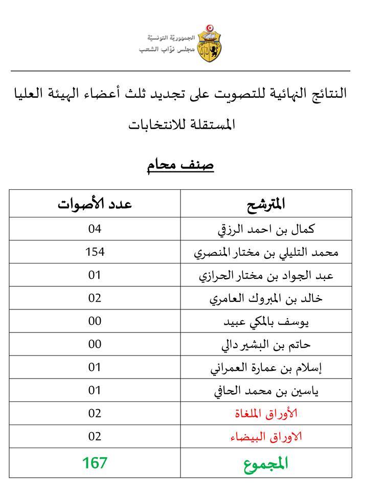 النتائج النهائية للتصويت على تجديد ثلث أعضاء الهيئة العليا المستقلة للانتخابات صنف محام