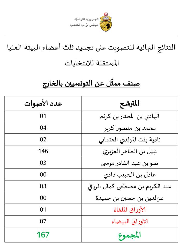 وكانت هذه النتائج النهائية للتصويت على تجديد ثلث أعضاء الهيئة العليا المستقلة للإنتخابات صنف ممثّل عن التونسيين بالخارج كما يلي :