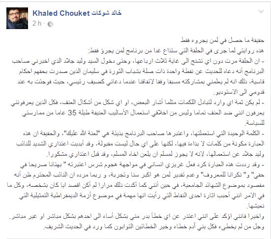 كما بيّن خالد شوكات أنّ الكلمة الوحيدة التي استعملها، واعتبرها صاحب البرنامج بذيئة هي "لعنة الله عليك"، والحقيقة أن هذه العبارة مكونة من كلمات لا بذاءة فيها، لكنها على اي حال ليست مقبولة، وقد أبدى اإعتذاري الشديد للنائب وليد جلاد عن استعمالها، لأنه لا يجوز لمسلم أن يلعن اخاه المسلم، وقد قبل اعتذاره وذلك وفق تدوينته.